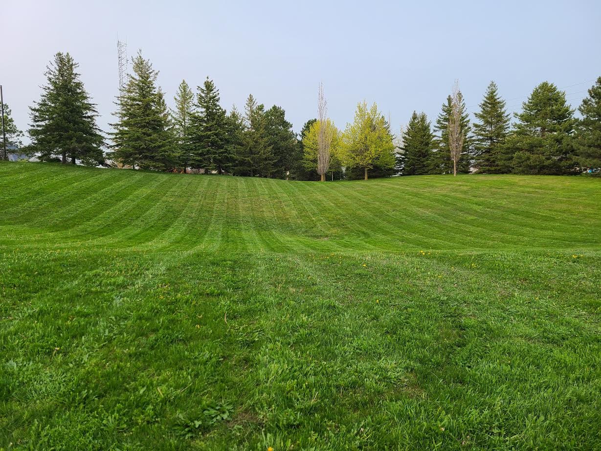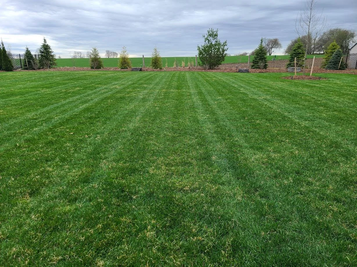 Lawn maintenance includes mowing at the appropriate height, edge trimming and clean up of grass clippings using a blower.